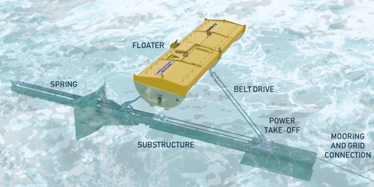 Der Schwimmkörper hat eine Fläche von 8 mal 2 Metern. Mit 2 Seilen ist er mit der Unterkonstruktion verbunden, die vollkommen untergetaucht ist. Sie wird von einer Art Ankerkette festgehalten. Der Schwimmkörper zieht im Takt des Wellengangs an den beiden Seilen. Sie bewegen sich über eine Umlenkrolle, die mit dem Generator verbunden ist. Eine kraftvolle Feder zieht sie zurück, wenn die Welle ausläuft und der Schwimmkörper sich wieder absenkt.
