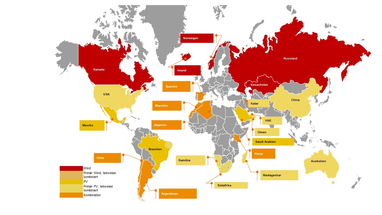 Deutschland hat sich bereits politisch dazu entschlossen, den Umbau des Energiesystems voranzutreiben. Doch die Bundesrepublik wird die grüne Energiewende nicht selbst schultern können. Es seien „beträchtliche Importe von erneuerbaren Energien via PtX aus dem Ausland“ nötig, um die Energiewende zu bewältigen, schließen die Studienautoren. Dabei könne ein solcher Markt weltweit eine Größenordnung von bis zu 20 000 TWh pro Jahr erreichen. Das entspricht etwa der Hälfte der heutigen Nachfrage nach Rohöl. Ein riesiger Markt also, in den viele Länder als Produzenten grüner synthetischer Kraftstoffe einsteigen könnten. Sie unterscheiden sich jedoch vor allem hinsichtlich ihrer Motivation, synthetische Kraftstoffe herzustellen, sowie hinsichtlich ihrer Ausgangslage als Marktteilnehmer auf internationalem Parkett. Sämtliche potenziellen PtX-Produzenten sind auf der Grafik verzeichnet.