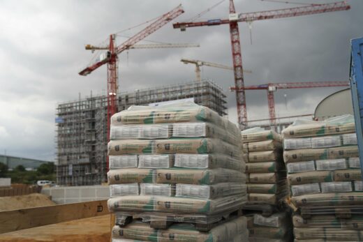 Symbolbild für die deutsche Bauindustrie mit Zementsäcken. Die Herstellung von Zement gehört zu den Prozessen im Baubereich, bei denen die meisten Treibhausgasemissionen entstehen.