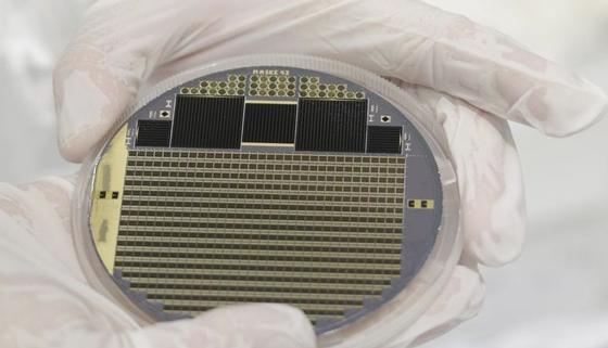 Solarzellenwafer mit Vierfach-Konzentratorsolarzellen und Teststrukturen.