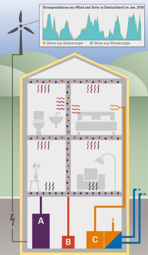 Wichtig: Ein hoher Dämm- und Effizienzstandard des Gebäudes ist entscheidend, um die Zeitspanne zwischen den Starkwindereignissen und den Engpasszeiten zu überbrücken. Nur in hoch effizienten Gebäuden ist das direktelektrische Heizen, das ansonsten ineffizient und verschwenderisch wäre, sinnvoll und nützlich für das Gesamtsystem.