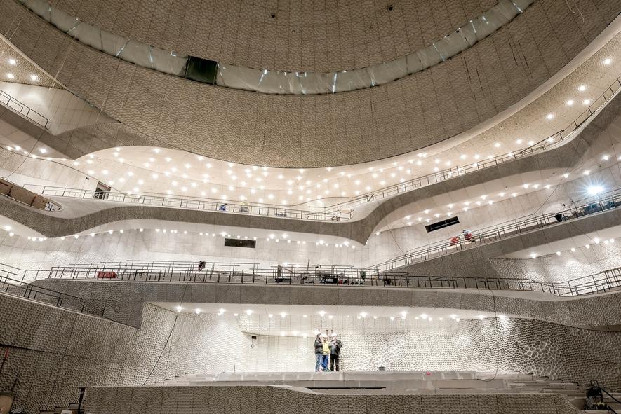 Die Elbphilharmonie im Hamburger Hafen auf dem ehemaligen Kaispeicher A wird eine Kathedrale der Musik. Aufwendiger dürfte weltweit kaum an der Akustik eines Konzertsaales gefeilt worden sein. Neben der besonderen Geometrie der Konzerthalle, deren Zuschauerränge nach dem Vorbild eines Weinberges mit vielen Terrassen rund um das Orchester gebaut sind, und den verwendeten Materialien ist auch die Oberflächenstruktur, die so genannte „Weiße Haut“, einzigartig.