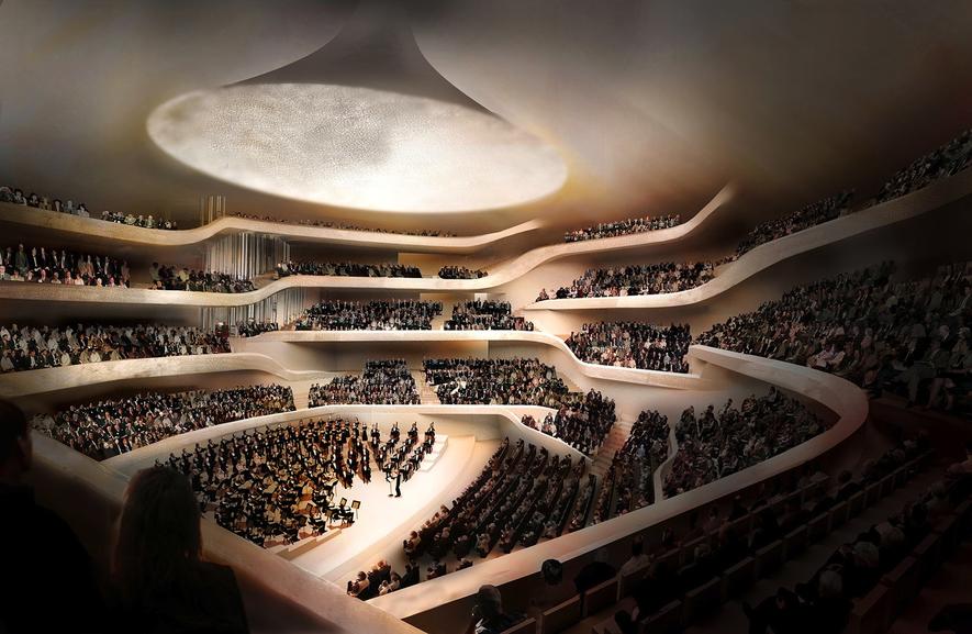 Es ist ein verwirrendes Vexierspiel aus Licht und Schatten, das die rund eine Million muschelförmig gefrästen Täler in den Platten mit einer variablen Frästiefe von 5 bis 90 mm im Auge des Betrachters hinterlassen. Natürlich ins Auge fällt der riesige Trichter in der Mitte des Konzertsaales, der von der Decke hängt und als Reflektor dient und die Musik perfekt im Raum verteilen soll.