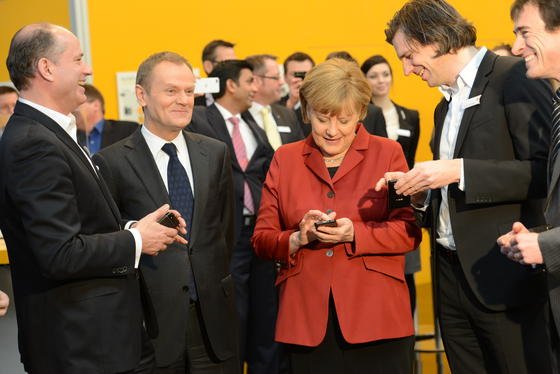 Bundeskanzlerin Angela Merkel auf der CeBIT 2013 am Stand von Secusmart: Das Düsseldorfer Unternehmen präsentiert in diesem Jahr auf der IT-Messe eine App, mit der sich Telefonate verschlüsseln lassen. Ziel ist ein abhörsicheres Kanzler-Handy für alle.