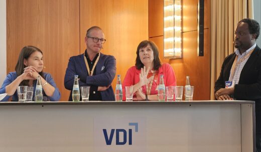 Podiumsdiskussion zum Thema „Was bedeutet KI für das zukünftige Ingenieurwesen?“ auf dem DIT 2025: Es diskutierten (v.l.n.r.) Sabine Frank von Google; Prof. Dr. Thomas Klindt von der Kanzlei Noerr; Dr.-Ing. Christine Maul von der Covestro Deutschland AG sowie Prof. Dr. Axel-Cyrille Ngonga Ngomo von der Universität Paderborn.