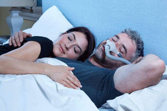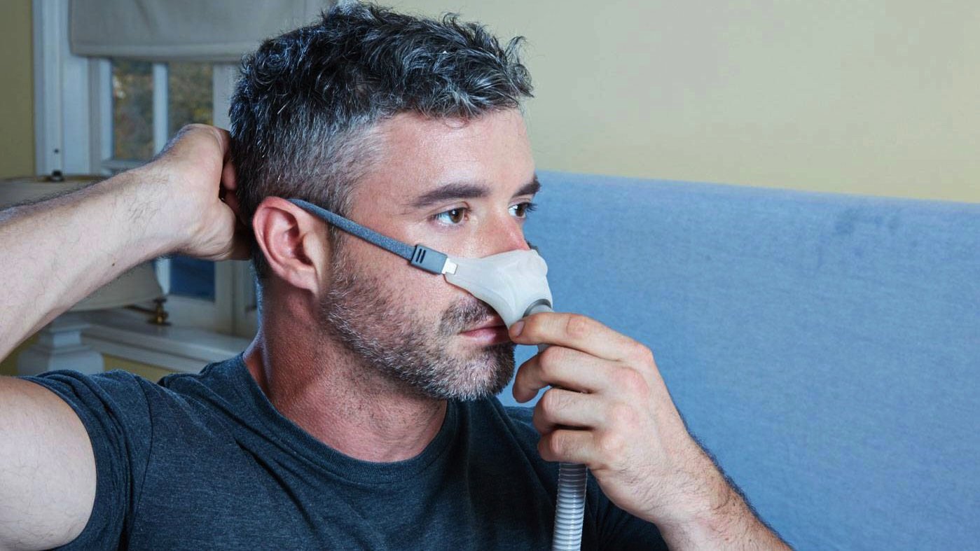 Die Maske wird mit einem Beatmungsgerät verbunden. Der gleichmäßige Luftstrom verhindert das Schnarchen.
