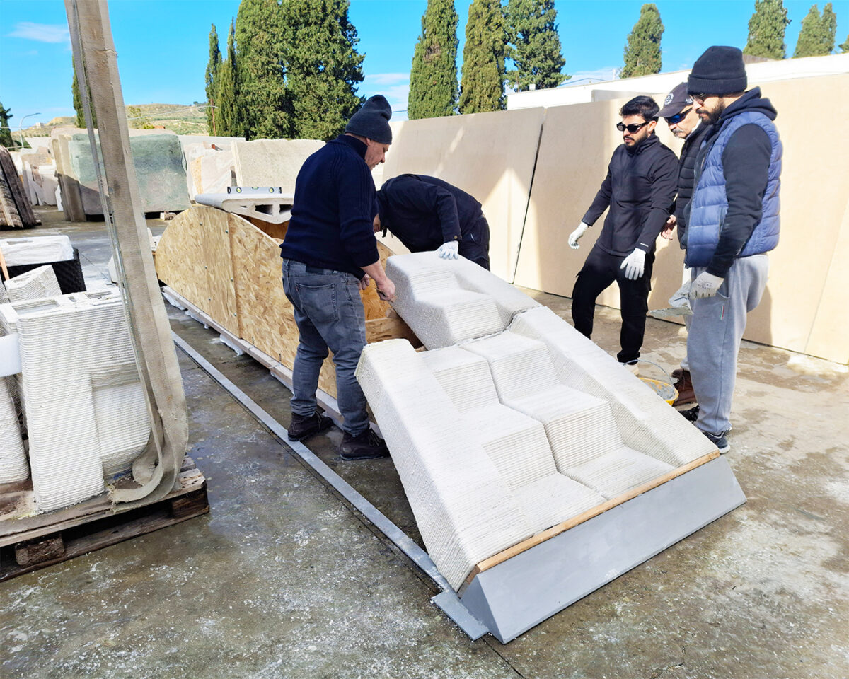 B&Y entwickelte den umweltfreundlichen Mörtel. Er besteht aus Abfallsteinmehl in Kombination mit einem Bindemittel auf Kalkbasis. Das Material bietet eine nachhaltige Möglichkeit, die Nebenprodukte der Marmor- und Steinverarbeitung wiederzuverwenden. In Form gebracht wurde es vom „WASP 3MT LDM Concrete“, einem großvolumigen Delta-Drucker. Die einzelnen Blöcke wurden abschließend von der Universität Bari mit einem System der temporären Zentrierung zusammengesetzt.
