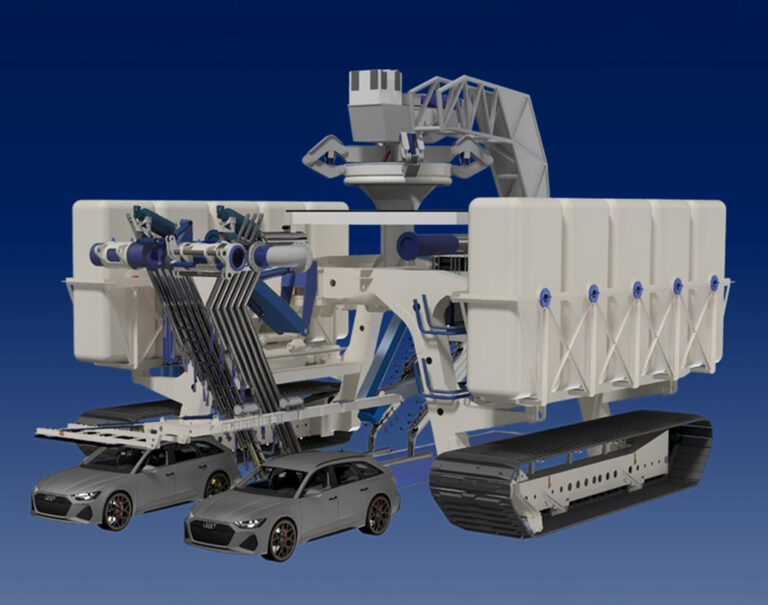 Hier hat der Hersteller zwei Autos mit ins Bild gesetzt, um die gigantischen Abmessungen der Maschine zu verdeutlichen.