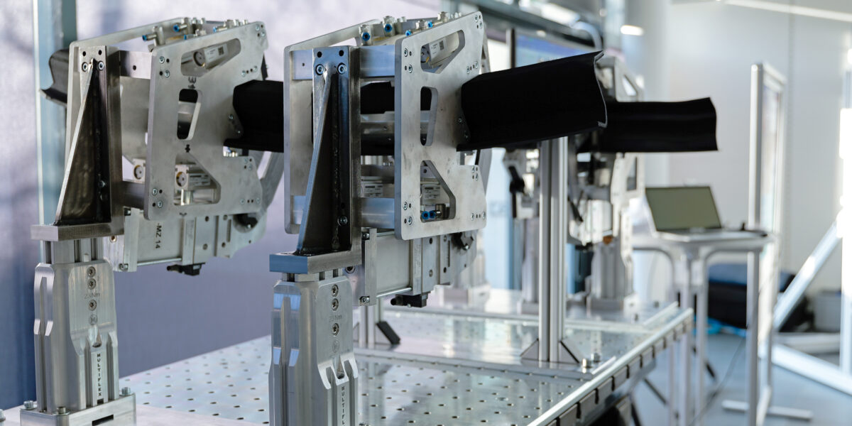 Hier entsteht eine Flugzeugtür: Die Vorrichtung für das automatisierte Spannen und Fügen von thermoplastischen Kohlefaserverbundmaterialien bei Flugzeugtüren wurde am Fraunhofer IWU entwickelt.