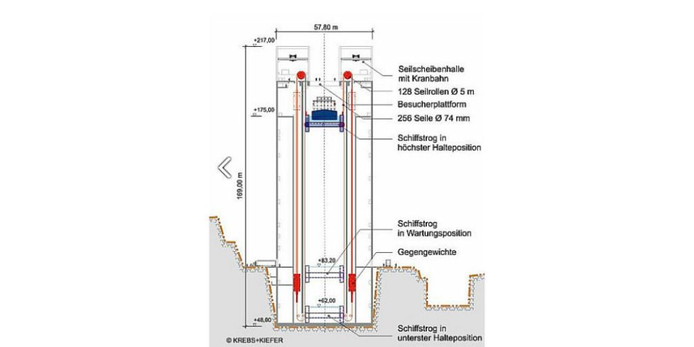 Beide Unternehmen hatten bereits Erfahrungen im Bau von Schiffshebewerken – wenn auch nicht in dieser Größenordnung. Sie hatten die technischen Grundlagen und die Planung für das Schiffshebewerk Niederfinow Nord im Oder-Havel-Kanal entwickelt.