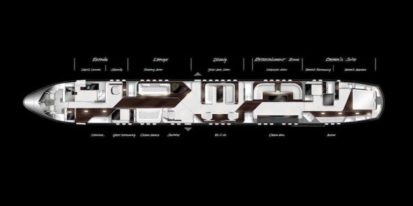 So empfängt den Fluggast beim Betreten der Kabine eine weite, offene „Willkommenszone“, darin integriert eine Küche, ein Séparée und ein Badezimmer. Hinter den Lounge- und Speisebereichen gibt es einen separaten Raum mit Unterhaltungs- und Informationstechnologie und einen privaten Bereich für die fliegenden Gäste.