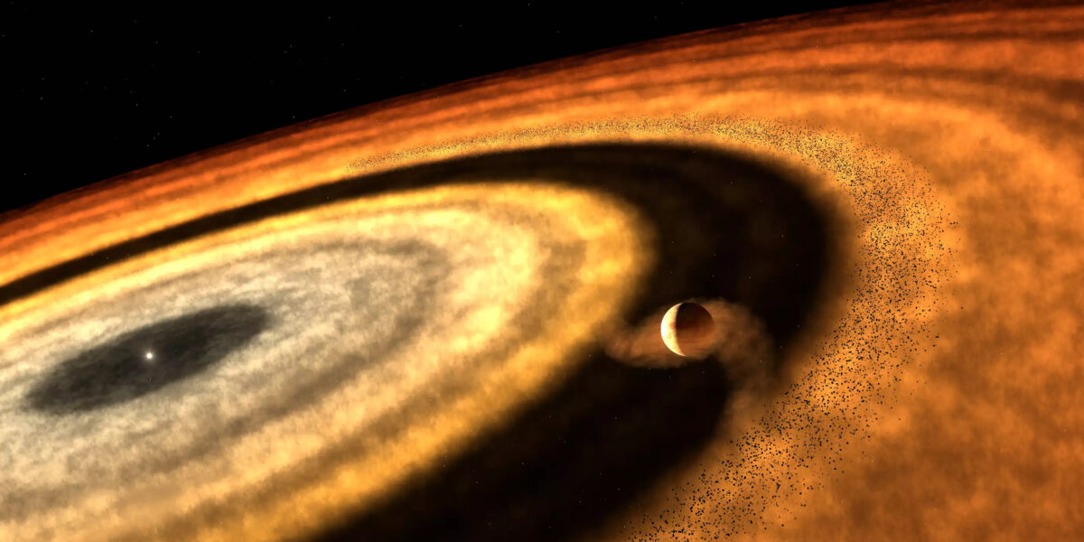 Diese künstlerische Darstellung zeigt das Stadium, in dem WASP-121b den größten Teil seines Gases angesammelt hat, wie aus den neuesten Ergebnissen geschlossen werden kann. Die Illustration deutet darauf hin, dass der entstehende Planet seine entfernte Umlaufbahn von festen Kieselsteinen, die Wasser in Form von Eis speicherten, geräumt hatte. Dadurch verhinderte die Lücke, dass weitere Kieselsteine den Planeten erreichten. WASP-121b muss anschließend aus den kalten, äußeren Regionen in Richtung der inneren Scheibe gewandert sein, wo er nun in der Nähe seines Sterns umläuft.
