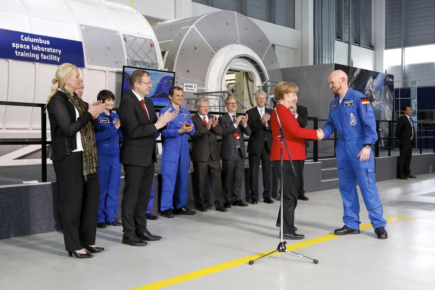 Bundeskanzlerin Angela Merkel und Astronaut Alexander Gerst inspizieren einen Nachbau der ISS im Astronautenzentrum in Köln: 2018 wird der inzwischen 40-jährige Deutsche wieder auf der echten ISS im All stationiert sein – drei Monate lang als Kommandant.