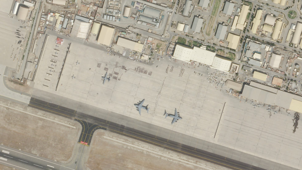 August 2021: Die Taliban stürzen Afghanistans Regierung, nachdem sich internationale Truppen quasi von heute auf morgen aus dem Land zurückgezogen haben. PlanetScope- und SkySat-Satelliten fangen die Situation rund um den Flughafen von Kabul ein. Hier spielten sich dramatische Szenen ab. Tausende Menschen stürmten am 16. August die Landebahn des Flughafens Hamid Karzai International, in der Hoffnung, einen PLatz in einer der Evakuierungsmaschinen zu bekommen. Die Bahn wurde schließlich geräumt, viele Menschen bleiben zurück. Die mangelhafte Evakuierung gilt vielen als politische und humanitäre Katastrophe.