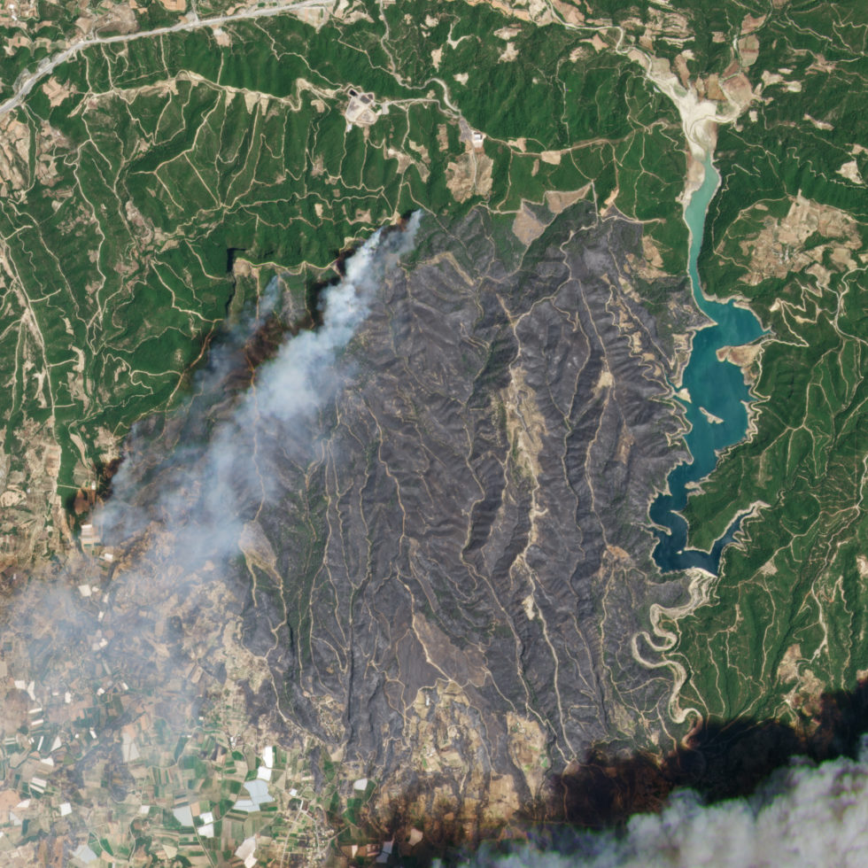 Auch Griechenland ist im Sommer 2021 von heftigen Waldbränden betroffen. Fast 60 Feuer breiten sich über das ganze Land aus und zerstören fünfmal mehr Fläche als im bisherigen Jahresdurchschnitt. Besonders betroffen ist unter anderem die Insel Euböa, wie dieses Bild zeigt.