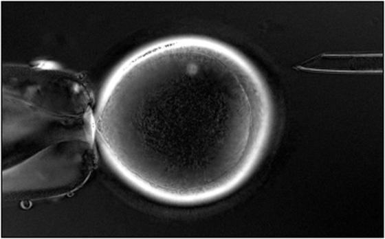 Eine Pipette hält eine Eizelle, der – ebenfalls mit einer Pipette – der Zellkern entfernt wird.