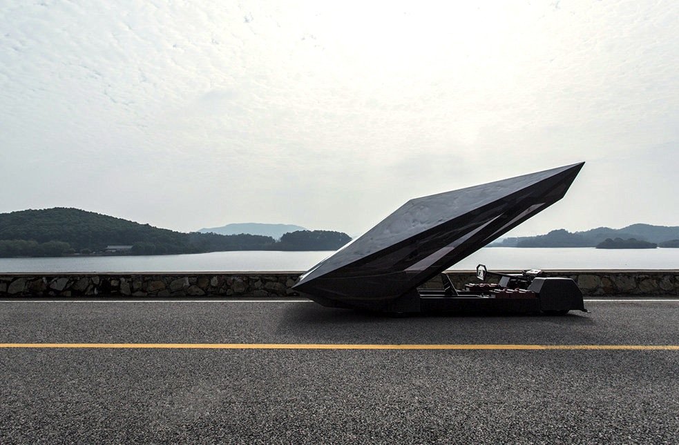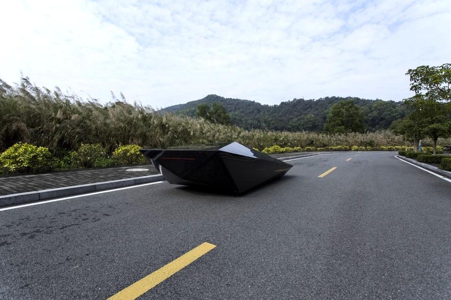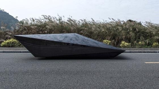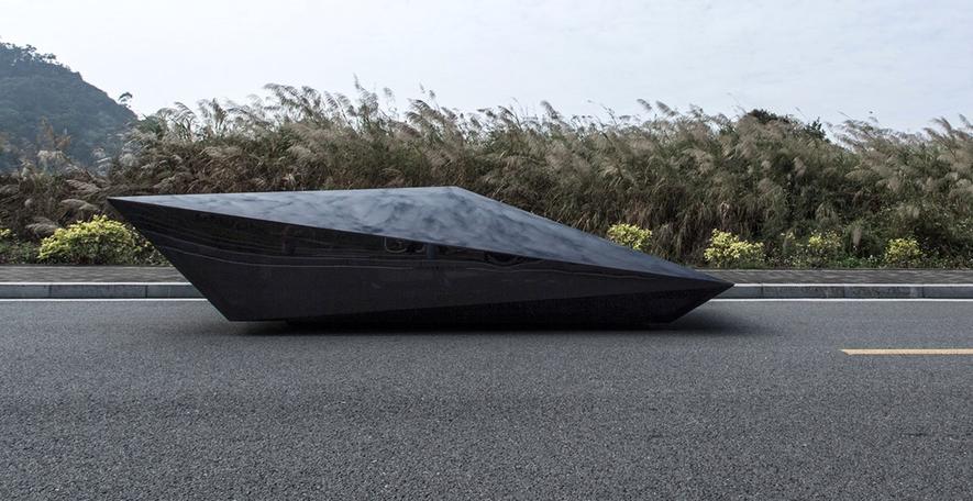 Das „Low Res Car“ ähnelt einem kleinen Raumschiff, das sich aus einer fremden Galaxie auf die Erde verirrt hat. Doch das schwebt nicht, sondern fährt sogar – auf vier Rädern. Die kann man allerdings nicht sehen: Sie sind von der Karosserie verdeckt.