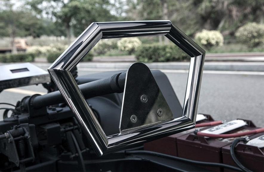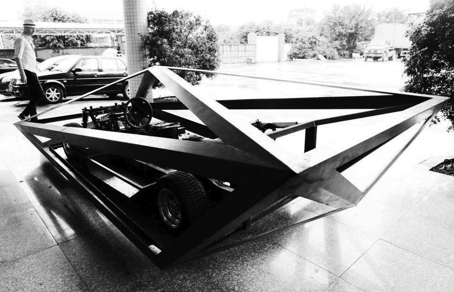 Die beiden Passagiere sitzen hintereinander in einem spartanisch eingerichteten Innenraum mit Wänden aus blankem Blech, den sie sich mit den offen liegenden Batterien teilen müssen. Das Lenkrad ist sechseckig und besteht aus dicken Edelstahlrohren, die meisterlich zusammengeschweißt sind.