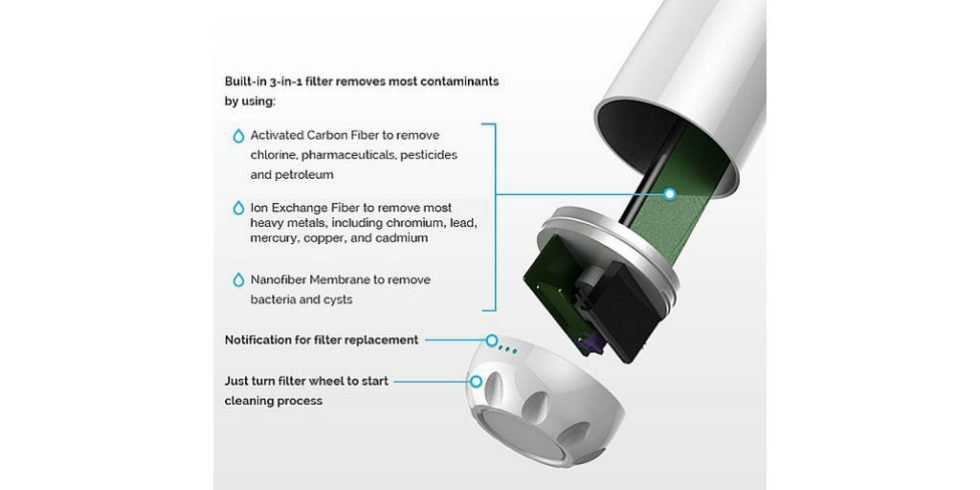 Ist die Wasserqualität nicht zufriedenstellend, dreht man den Boden der Flasche und aktiviert dadurch das Filtersystem. Eine Lage dieses Filtersystems besteht aus Aktivkohle, wie in herkömmlichen Wasserfiltern. Die zweite Lage ist eine Faser, bei der durch Ionen-Austausch Schwermetalle entfernt werden und schließlich folgt eine Membran aus Nanofasern, die Bakterien und andere Mikroorganismen herausfiltern sollen. Nun wäre ein erneutes Schütteln der Flasche angebracht, um zu sehen, ob das Wasser nun Trinkqualität besitzt. Die Filter müssen etwa jedes halbe Jahr ausgetauscht werden.