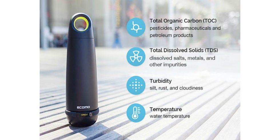 Einfach schütteln und einmal drehen – die Flasche Ecomo testet die Trinkwasserqualität und übernimmt, falls nötig, auch sofort die Filter-Reinigung. Auf Kickstarter hat die kleine Wasserflasche, die auch Big Data sammelt und Auskunft über die persönliche Hydrierung gibt, einen fulminanten Start hingelegt.
