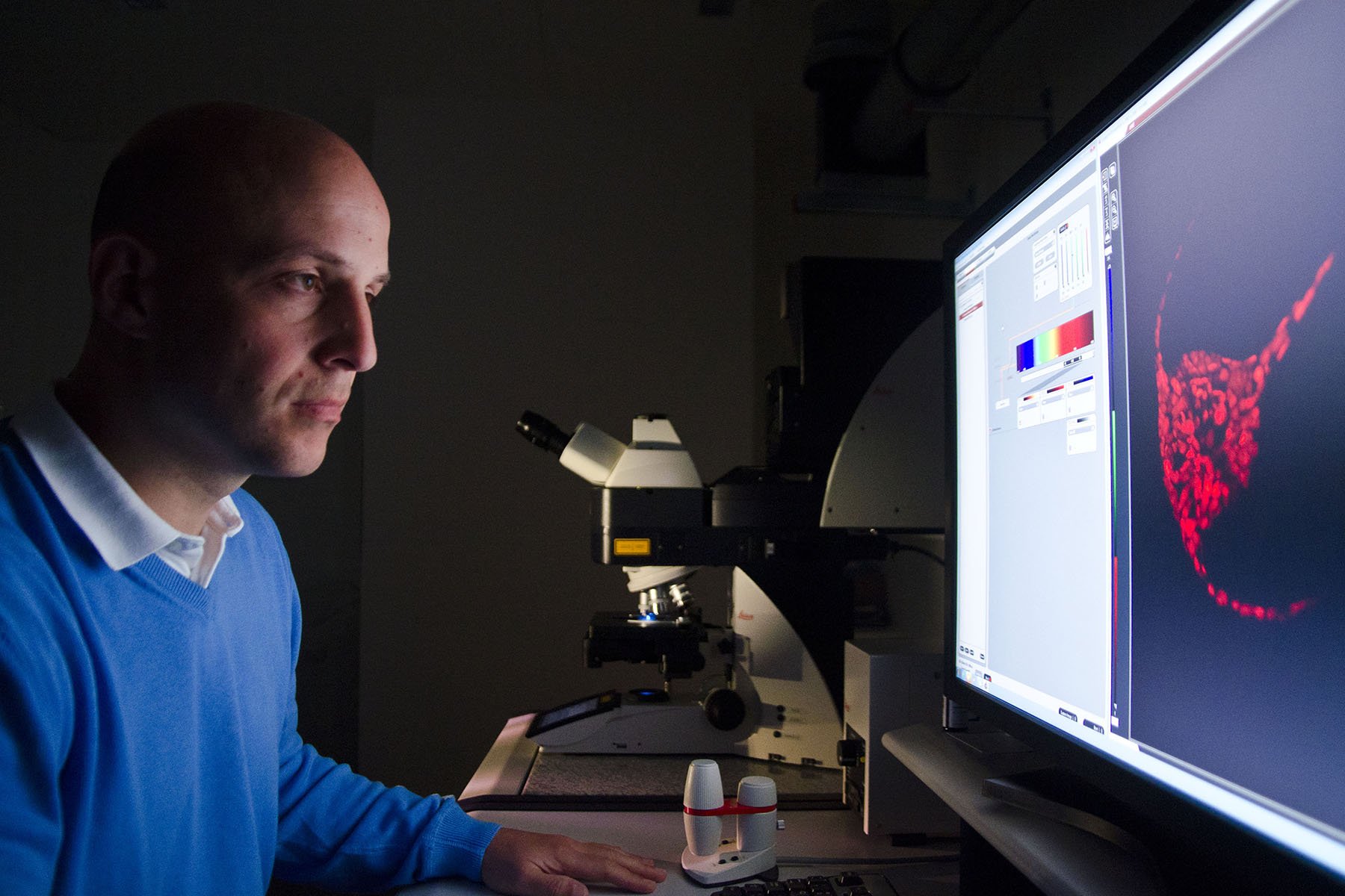 Forscher Jan Michels am Konfokalen Laserrastermikroskop.