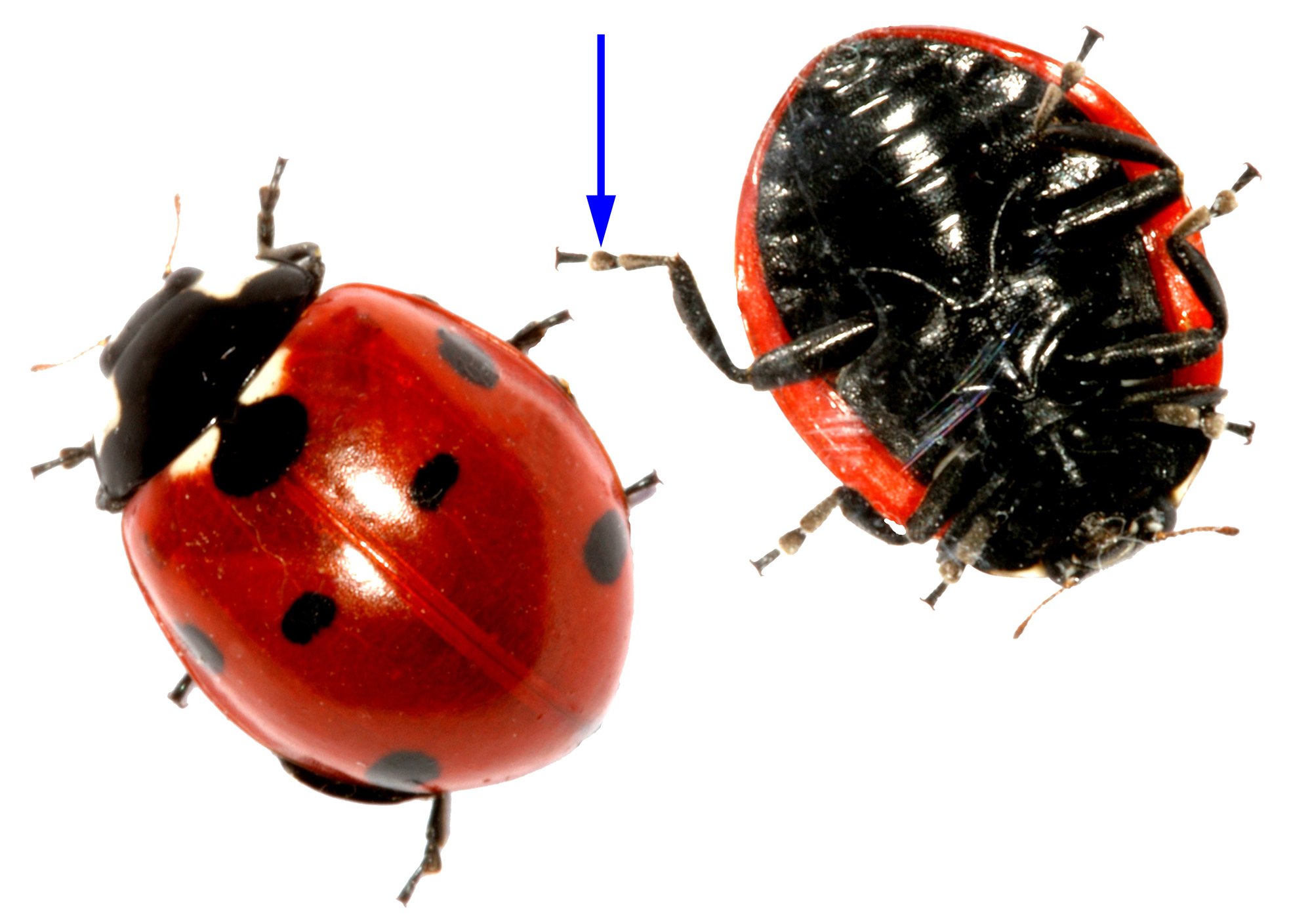 Oberseite und Unterseite eines Siebenpunkt-Marienkäfers: Der blaue Pfeil markiert exemplarisch eines der Hafthaarpolster des Käfers.
