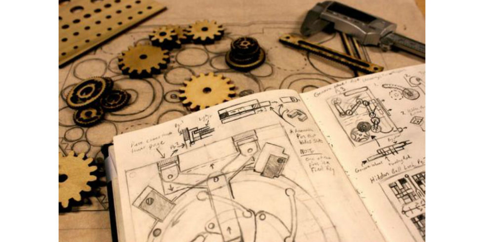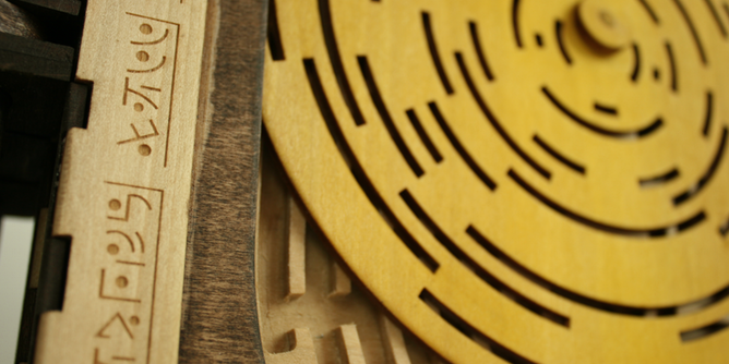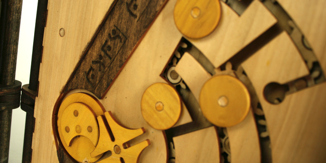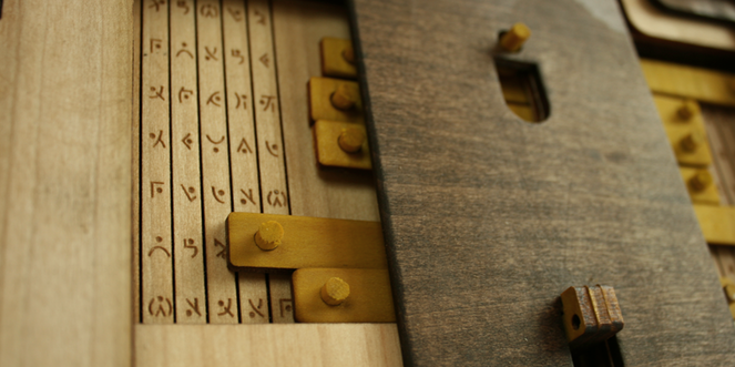 Es erinnert schon an die komplexen Maschinen, die Leonardo da Vinci entworfen hat: Gewirre aus Rädchen, labyrinthische Gänge, dazu noch geheimnisvolle Schriftzeichen. Und das alles aus Holz, zusammengefügt zu einem Buch, das von außen wie eine Schatzkiste anmutet.
