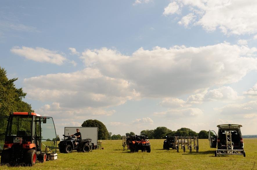 Mit diesen Werkzeugen vermaßen sie ein Areal von zwölf Quadratkilometern bis zu einer Tiefe von drei Metern, indem sie es mit einem an einen Aufsitzrasenmäher erinnernden Gefährt abfuhren, an dessen Aufbau am Heck die unterschiedlichen Messinstrumente befestigt waren. Die Geräte erfassten dabei nicht nur Steinstrukturen, sondern auch organisches Material wie Holz – sogar in verkohlter Form, zum Beispiel in Feuerstätten.