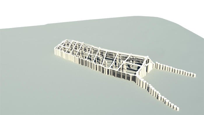 Ausschnitt der 3D-Umgebungskarte: Der Bodenradar hat ein acht Meter breites und 33 Meter langes Holzhaus sichtbar gemacht. Es ist vermutlich 6000 Jahre alt.