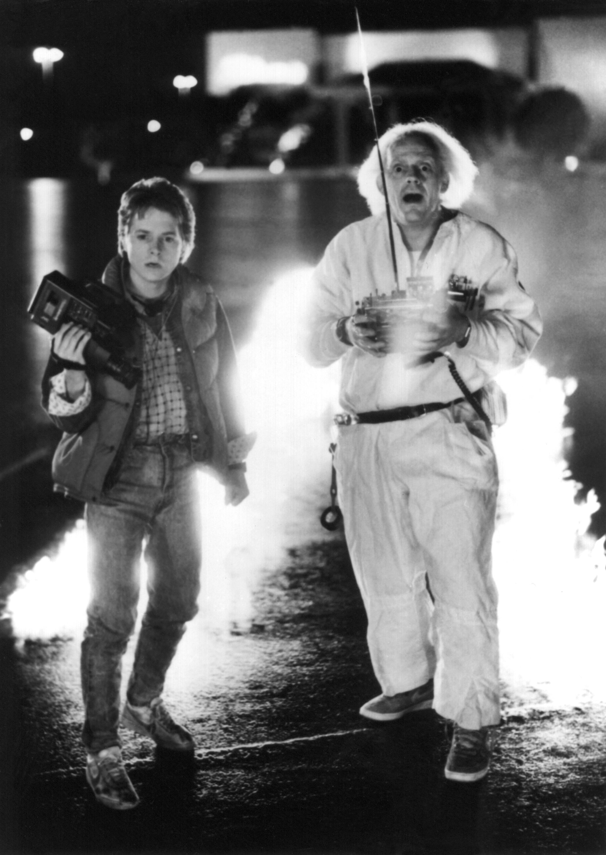 Der Schüler Marty McFly (l., Michael J. Fox) und der Erfinder Dr. E. Brown (Christopher Lloyd) im ersten Teil der Filmtriologie „Zurück in die Zukunft“.