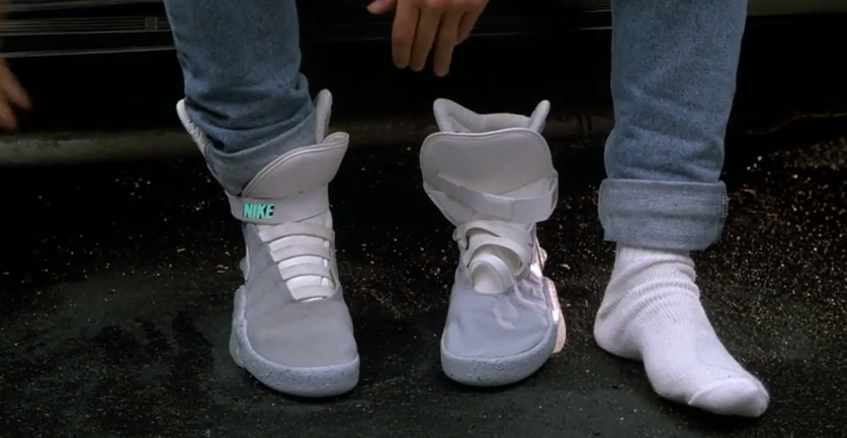 Im Jahr 2015 angekommen drückt Doc Brown dem jungen McFly erst einmal ein der Zeit angemessenes Schuhwerk in die Hand. Die grauen Sneaker kommen bei dem Teenager vor allem deshalb gut an, weil man sie nicht selbst zubinden muss. „Powerlaschen“ nennt der Film die Technik dahinter. Gibt’s nicht? Gibt’s doch! In einer Stückzahl von nur 1500 Exemplaren hat Bekleidungshersteller Nike Schuhe mit vergleichbarer Technik in den Verkauf gebracht. In der Realität vollzieht sich das automatische Zuschnüren allerdings deutlich weniger schnell als im Film.
