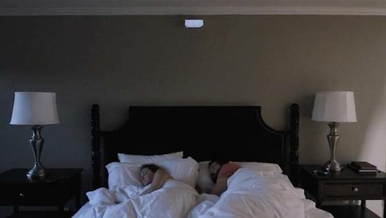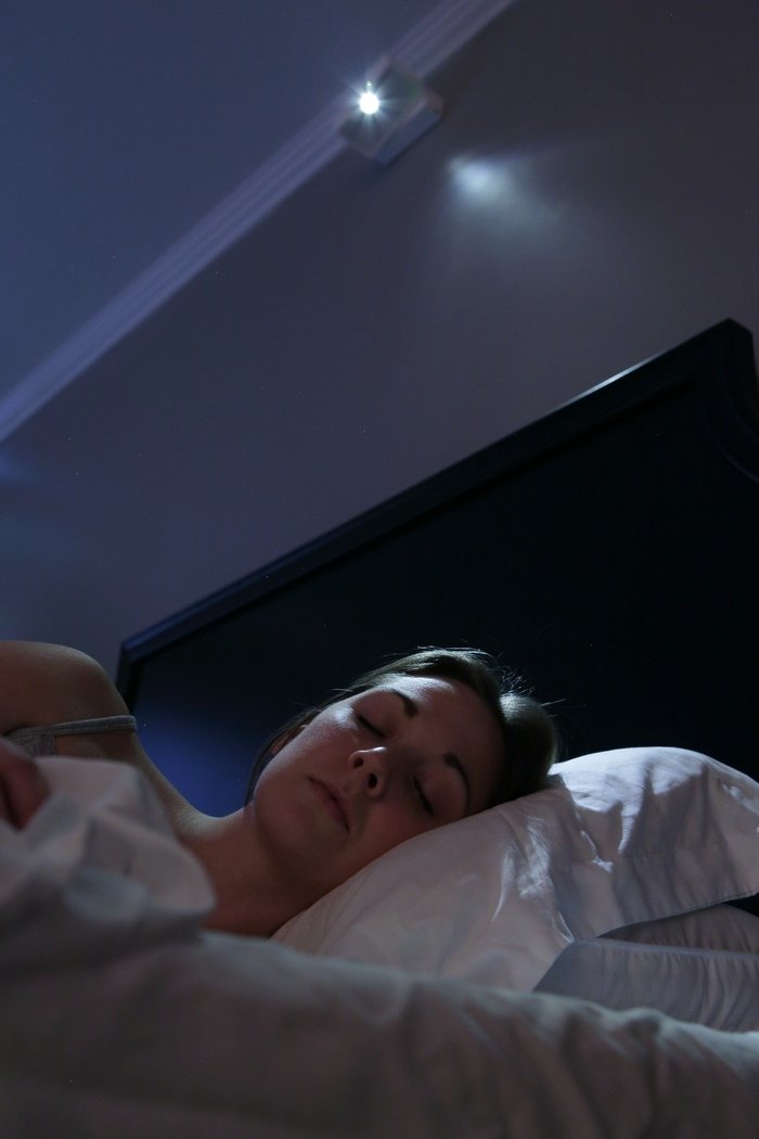 Das an der Decke montierte Wake-System arbeitet mit Licht. Sanft soll es nur eine der schlafenden Personen im Doppelbett wecken.