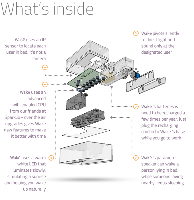 Dazu wird das Gerät, eine weiße Box, über dem Bett angeschraubt. Kabel sind keine nötig, sondern nur Batterien. Mit Hilfe einer App und eines Smartphones wird die Box auf die gewünschte Weckzeit programmiert. Um sich auf die Person zu konzentrieren, die früher aufstehen möchte, benutzt der Wecker keine Kamera, sondern einen Sensor, der auf Körperwärme reagiert: Der Infrarotsender sucht das Bett ab und sendet anschließend ein weißes LED-Licht gezielt zu dem Schläfer, der geweckt werden soll.