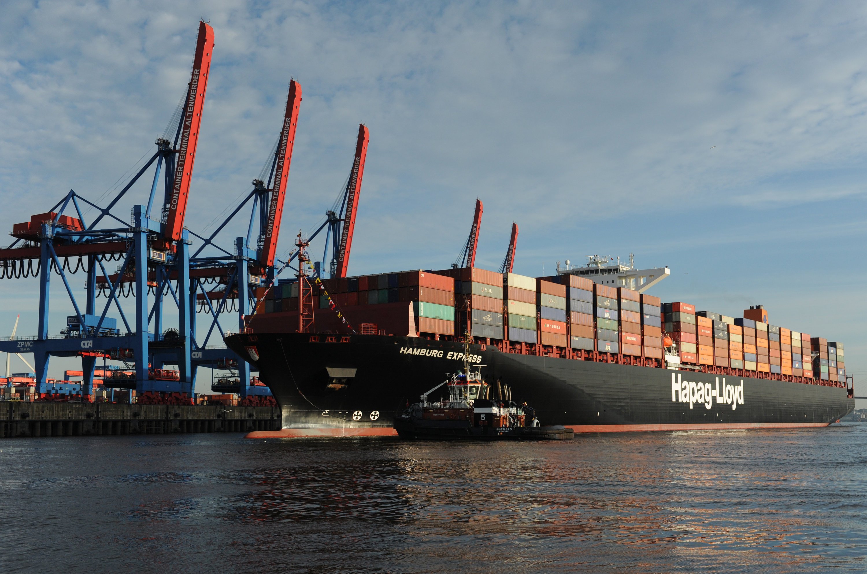 Ein Schiff der Reederei Hapag-Lloyd macht in Hamburg auf der Elbe am Container Terminal Altenwerder (CTA) fest. Die Schiffe müssen regelmäßig von Seepocken gereinigt werden. Denn gemeinsam mit Muscheln und Algen erhöhen die Krebstiere den Wasserwiderstand der Schiffe und erhöhen ihren Treibstoffverbrauch.