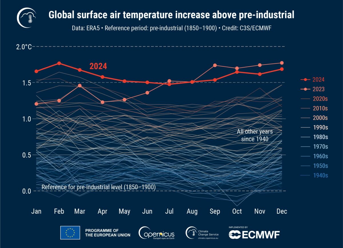 Laut den neuesten Auswertungen des EU-Satellitendienstes Copernicus war es weltweit das wärmste Jahr seit Beginn der Aufzeichnungen. Erstmals wurde durchgehend die 1,5-°C-Grenze überschritten, im Schnitt waren es sogar 1,6 °C über dem vorindustriellen Niveau, weitere Rekordwerte (seit Beginn der Messungen) in den Klimadaten 2024 kommen hinzu. „Alle international zusammengestellten globalen Temperaturdaten zeigen, dass 2024 das wärmste Jahr seit Beginn der Aufzeichnungen im Jahr 1850 war“, so Carlo Buontempo, Direktor des Copernicus Climate Change Service, ECMWF.