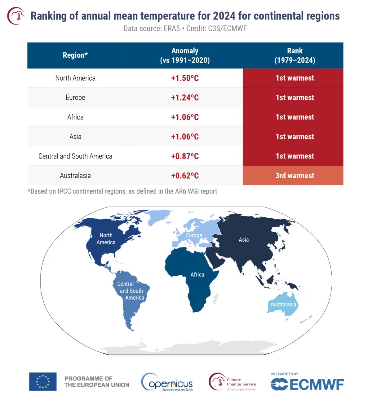 Europa und Nordamerika erlebten laut den Klimadaten 2024 von Copernicus eine Vielzahl von Extremereignissen wie Hitzewellen, Waldbrände und Überschwemmungen. In Afrika und Südasien litten Millionen von Menschen unter anhaltenden Dürreperioden, während der Anstieg des Meeresspiegels in den Küstenregionen von Bangladesch und den Malediven zu massiven Landverlusten führte.
