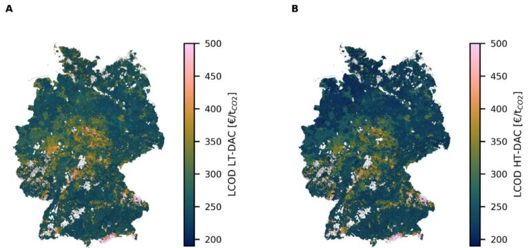 Weil das so ist, so das FZ Jülich in einer Mitteilung, sei „ein flächendeckender, pauschaler Ausbau von DAC wirtschaftlich kaum sinnvoll“. In der Studie haben die Fachleute alle 11.000 deutschen Gemeinden betrachtet. Wie beeinflussen Temperatur, Luftfeuchtigkeit und das Potenzial für Wind- und Solarenergie Leistung und Kosten von DAC-Anlagen?