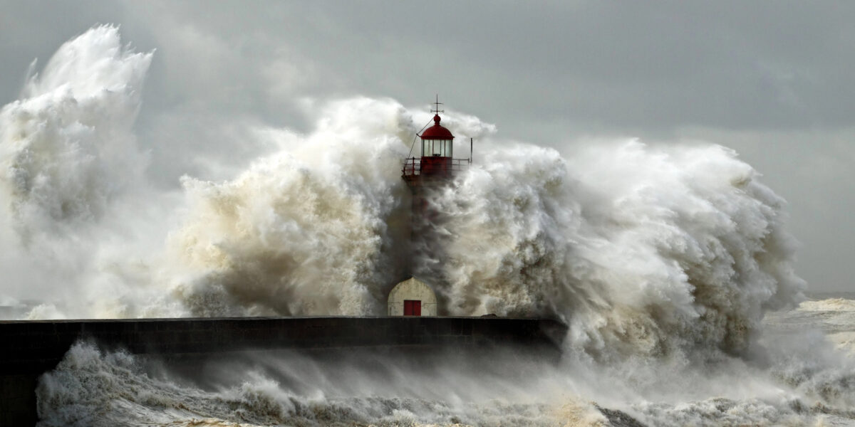 Wenn der Sturm richtig tobt, schlagen die Wellen schnell über einem Leuchtturm zusammen. So auch hier bei der Mündung des Duoro in den Atlantik bei Porto.