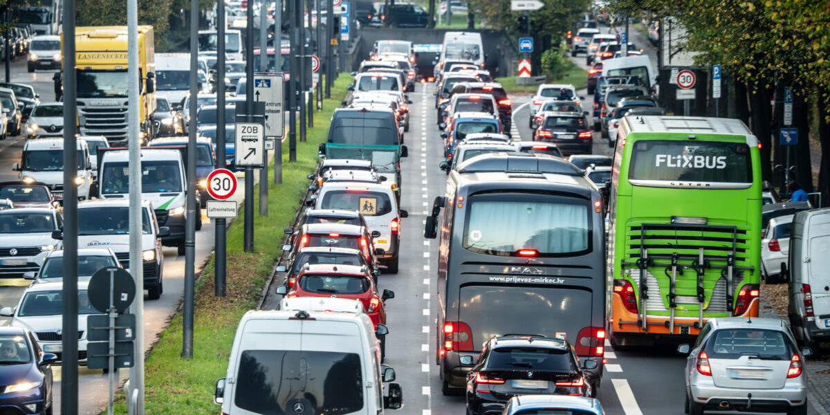 Stau auf der Landshuter Allee in München: Um bis 2045 klimaneutral zu werden, reichen die bisherigen Maßnahmen nicht aus, so der Klimaschutzbericht Deutschland. Problemfelder dabei sind Verkehr und Gebäude.