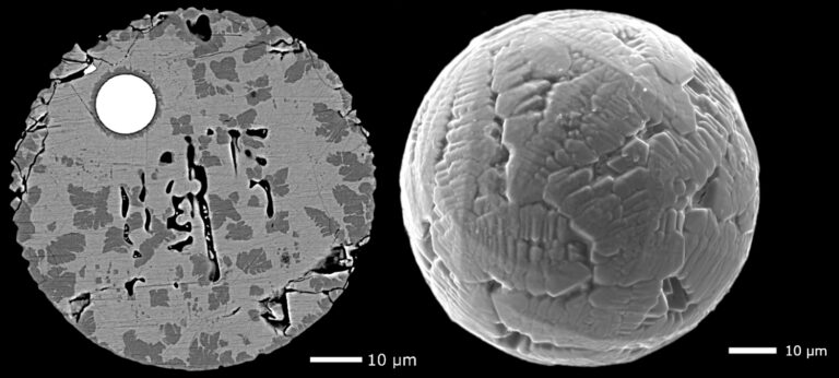 Links: Querschnitt eines antarktischen Mikrometeoriten. Rechts: Elektronenmikroskopische Aufnahme eines 240 Millionen Jahre alten Mikrometeorits.