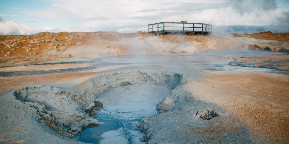 Geothermisches Kraftwerk auf Island - aus den Schornsteinen strömt Wasserdampf.