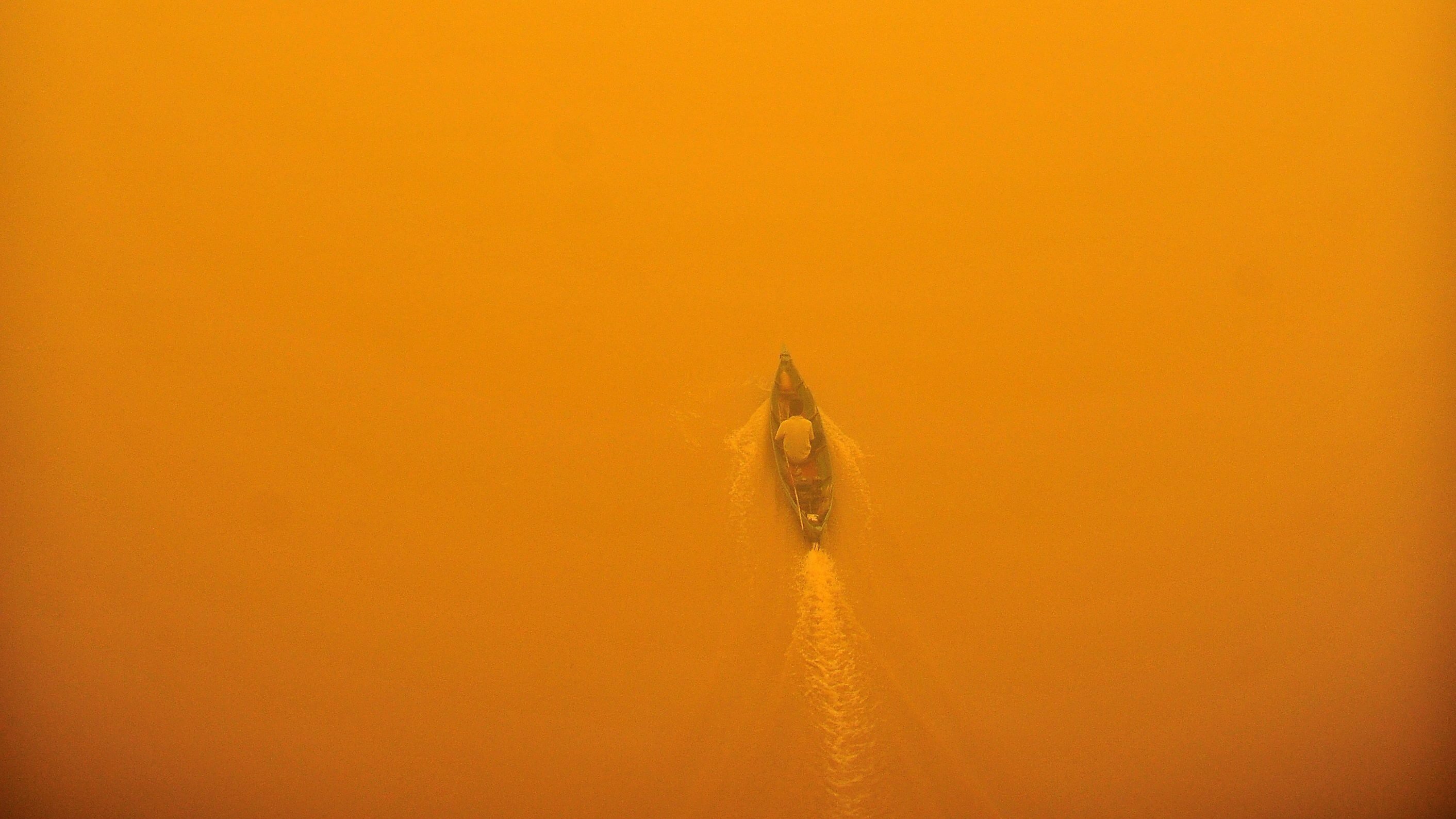Kaum zu erkennen: Ein Holzboot auf dem Fluss Kahayan in Indonesien. Die Aufnahme stammt vom 23. Oktober 2015. Schuld an dem Desaster sind Brandrodungen.