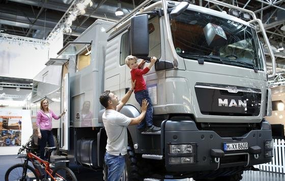 MAN-Truck des österreichischen Allrad-Wohnmobil-Herstellers Action Mobil: 590 Aussteller präsentieren bis zum 4. September rund 2.100 Freizeit-Fahrzeuge in der Messe Düsseldorf.