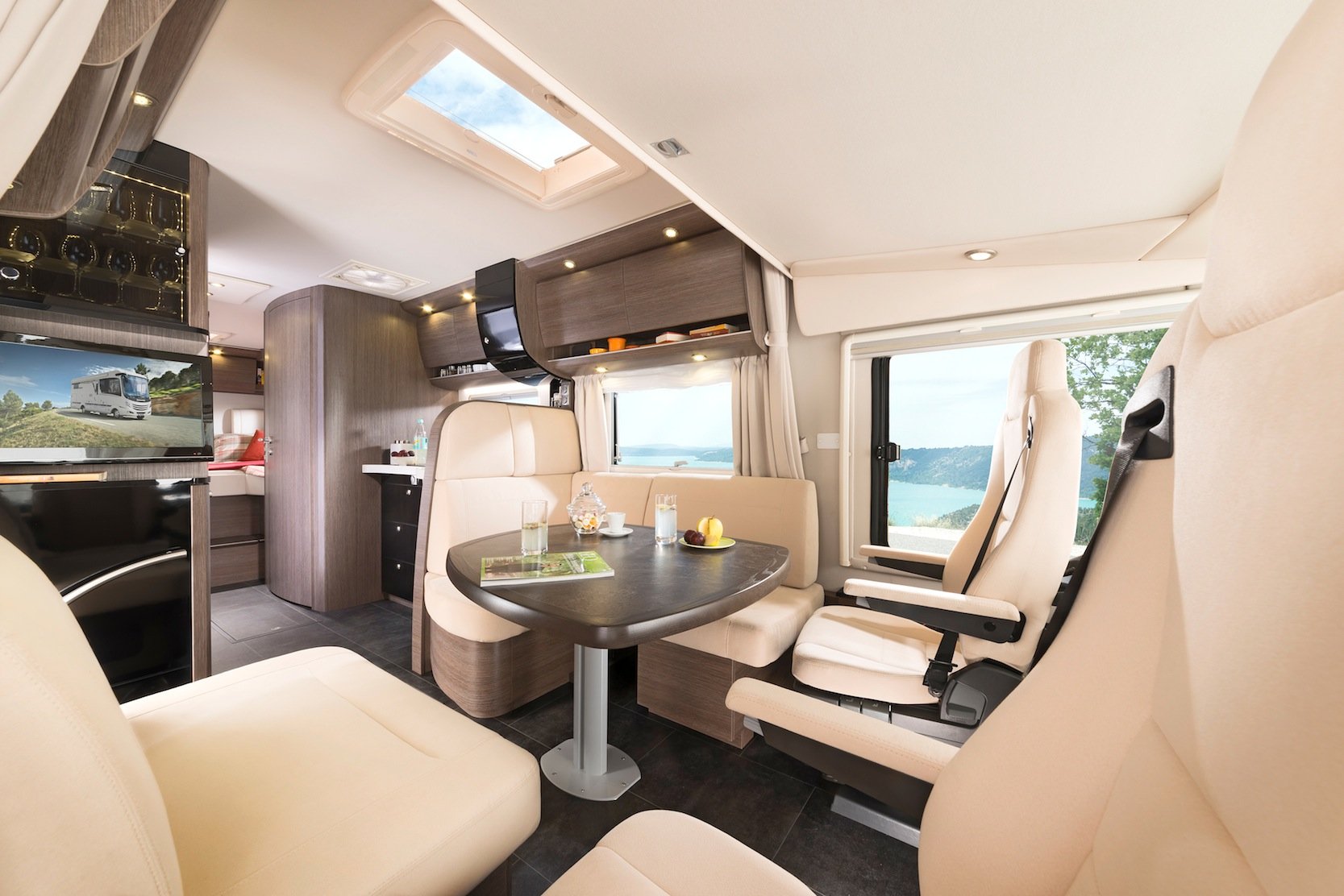 Fangen wir mit Luxus an: Concorde präsentiert auf der Messe seinen neuen Carver 890 RRL – ein knapp 9 m langes Vier-Zimmer-Luxus-Mobil auf Basis eines Iveco Daily mit 3-Liter-Euro-6-Motor, Schaltgetriebe und 150 PS. Der Innenraum bietet reichlich Platz. Dank Hubbett und Hecksitzgruppe konnten die Entwickler neben Wohnbereich und Bad einen separaten Schlaf- und Arbeitsraum realisieren – wie in einer richtigen Wohnung. Das hat allerdings auch seinen Preis: In der Basisversion kostet der Carver 176.890 €.