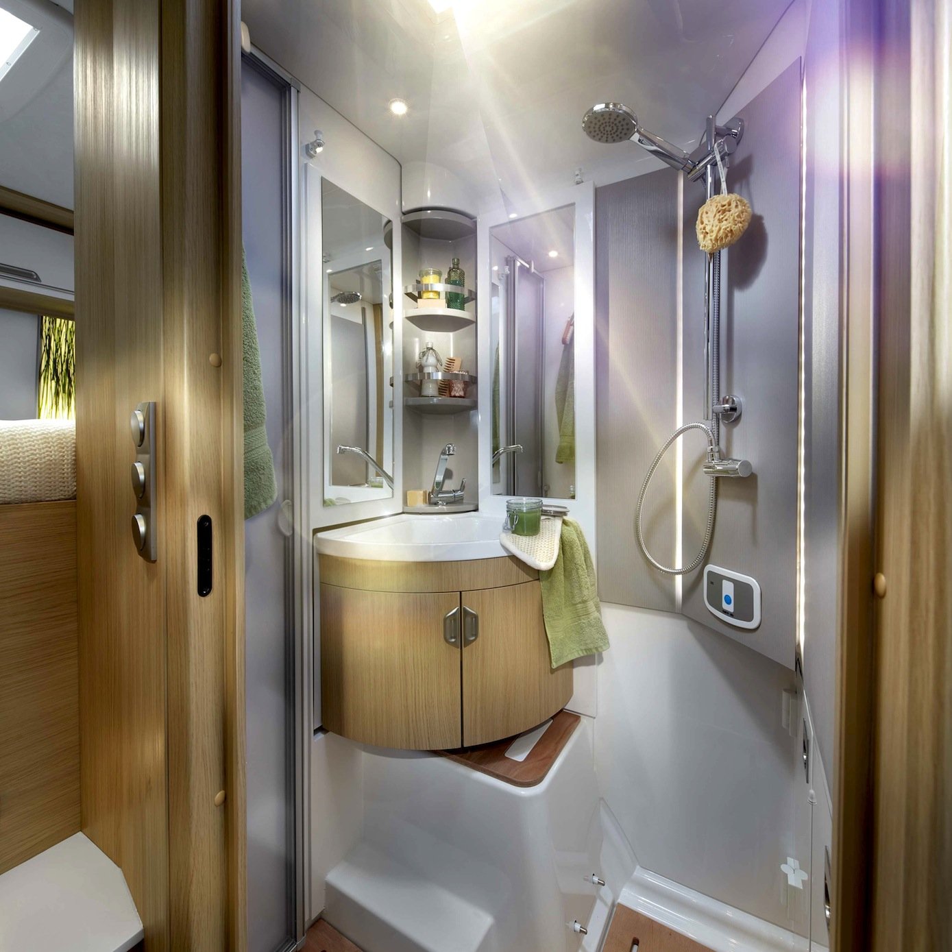 Teurer wird es wieder am Stand der Luxusschmiede Niesmann+Bischoff, die mit dem Smove ihr erstes teilintegriertes Wohnmobil enthüllt. Die Entwickler haben sich erfinderisch gezeigt, um im 15 m2 großen Innenraum Platz zu schaffen. Im Bad lassen sich beispielsweise Toilette und Eckwaschbecken in die Wand schieben, sodass ein geräumiger Duschplatz entsteht.