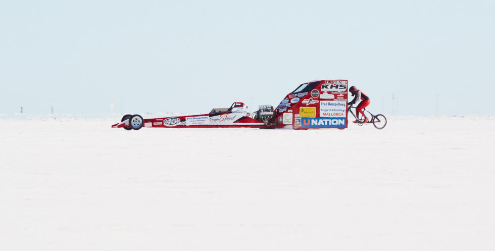 Das Rad muss mit einer sogenannten Doppel-Übersetzung ausgestattet sein. „Der Gang wird also so hoch sein, dass ich den aus dem Stand heraus nicht treten kann“, führt er aus. Von dem Sportwagen wird Prünte anfangs durch ein Seil mitgezogen.