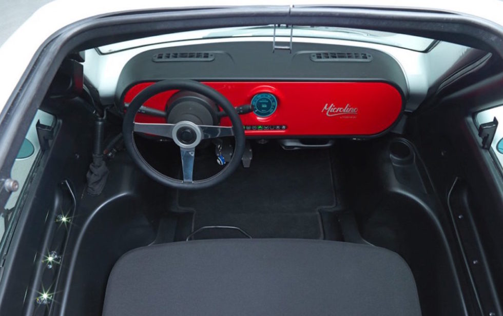 Pure nostalgische Eleganz: das Elektroauto Nobe 100 mit drei Rädern. Ohne Targa-Dach wird der Nobe zum Cabrio. Auch das Interieur ist pure Nostalgie.