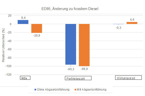 Das sind die Messergebnisse zum Bio-Ethanol: Am Motorenprüfstand war ED95 nahezu rußfrei und schnitt um Länge besser ab als fossiler Diesel. Das hat Folgen. Denn wenn normaler Diesel verwendet wird, hängt die Stickstoffemission von den ausgestoßenen Partikeln ab. Es wäre also möglich, den Motor so abzustimmen, dass ED95 auch beim Stickstoff viel bessere Werte erzielt.