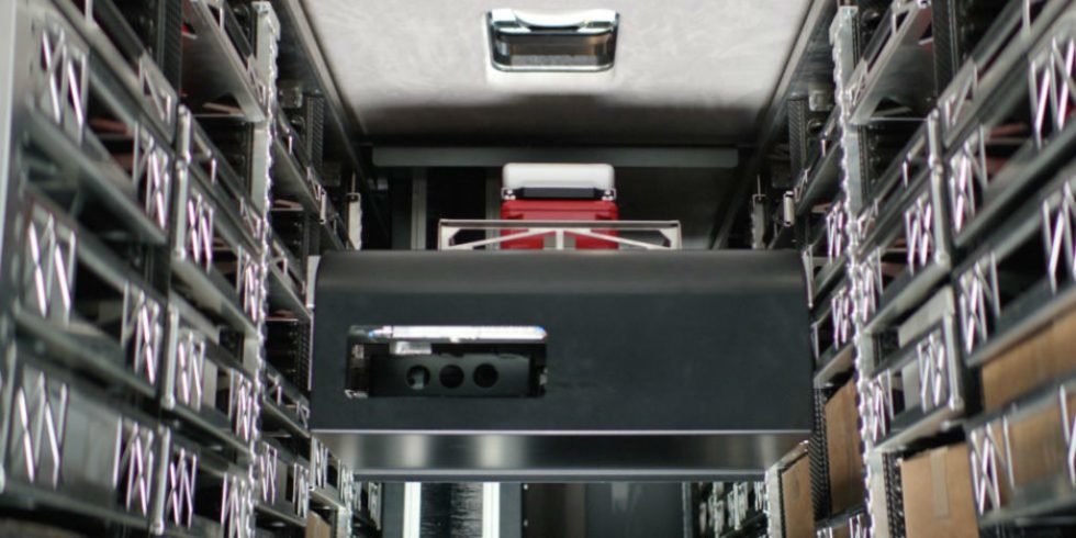 Doch die Anordnung der Pakete wird nicht dem Zufall überlassen. „Neuartige Algorithmen steuern Kommissionierung und Verladung der Packstücke“, so Mercedes. Die Sendungen werden im Logistikzentrum automatisch kommissioniert und in die speziellen Regalsysteme verladen. Ähnlich wie in einer Kantine gibt es verschiedenen große Tabletts, die der Größe der Pakete angepasst werden. Die Roboter schieben so die Packstücke in unterschiedlich große Einschübe, damit kein Raum verloren geht. Das Leichtbausystem besteht aus Karbonregalen sowie Ladungsträgern aus Aluminiumblech.