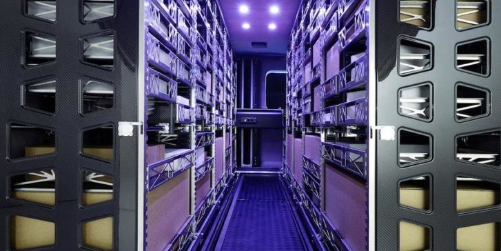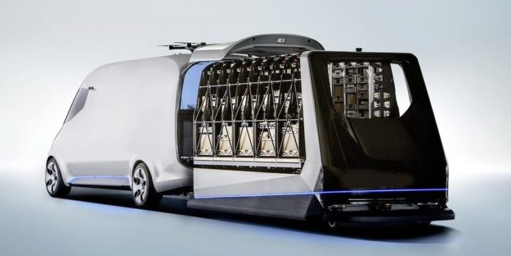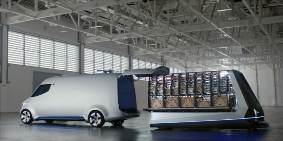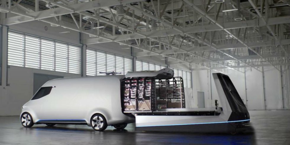 Mit dem Vision Van, den Daimler auf der IAA Nutzfahrzeuge vom 22. bis 29. September in Hannover vorstellt, wagt der Hersteller einen revolutionären Blick auf das Transportwesen von Übermorgen. Die ungewöhnlichste Idee: Die Regale im Transporter sind nicht fest montiert, sondern stehen auf einem Modul, das variabel ein- und ausgeladen werden kann. Und das macht möglich, das Modul vorher von Robotern beladen zu lassen.